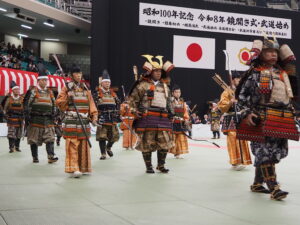 鎌倉時代に行われた出陣式を参考に、総勢55名の武者行列が武道館大道場で行進!鏡開き式は毎年成人の日に日本武道館にて開催しております。